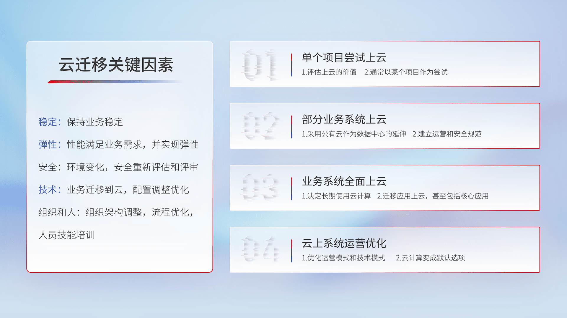 结合实际业务,,,从规划设计、、、云平台选型、、云原生改造、、、数据迁移、、、、集成交付,,,迁移全过程为客户识别最佳上云路径,,做好风险识别管理,,设计网络架构、、、身份权限、、安全审计合规、、、、操作审计、、日志审计、、监控告警策略、、、、多站点容灾设计等,,,对云上基础设施进行整体规划,,,提升IT治理水平,,,,以满足弹性、、高可用、、、高性能的需求。。