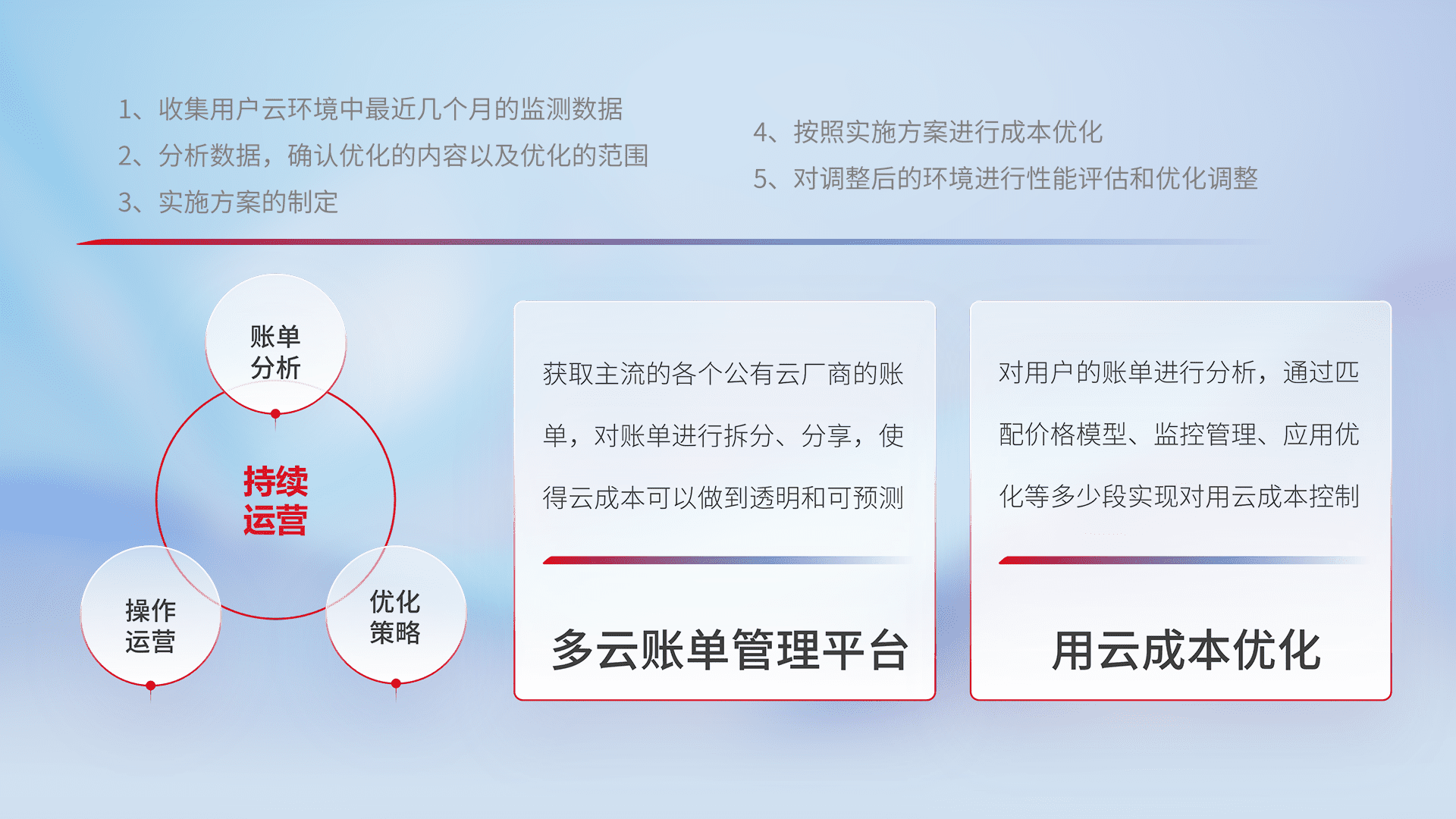 通过多云纳管,,,以统一的资源数据模型把客户的云资源进行抽象和封装,,,,进而实现对多云资源的统一操作,,,保障云资源管理的可靠性、、、稳定性与可用性。。。量身定制化运维内容,,,,配置、、开发运维、、、、补丁管理、、备份、、监控、、、、认证和访问管理、、、审计和日常巡检等,,保障在用云过程中的可靠度,,,稳定度以及高可用率。。。